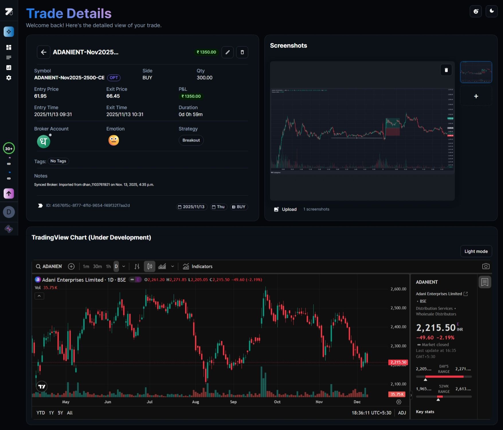 • Complete trade snapshot β€” Entry, exit, P&L, duration, and all your notes live together on one page